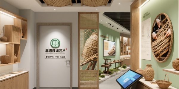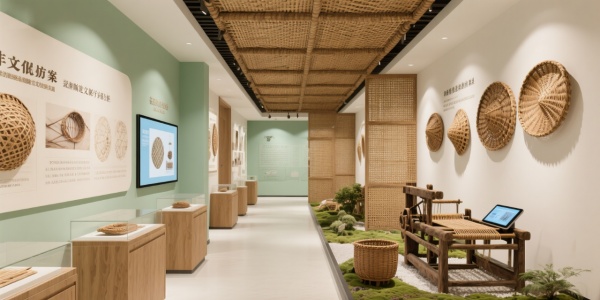 色彩運用主色調:原木色(自然與溫暖) + 米白(簡約優雅);漸變效果:淡綠色墻面,展示藤編的自然氣息。設計元素材質:老藤材(歷史感)、天然纖維(工藝載體)、互動屏(展示藤編過程);符號提煉:將藤編的紋路放大,作為空間隔斷。場景化模塊文化長廊:光影展示藤編歷史,觸控屏提供詳細信息;體驗區:提供仿古編織機,讓觀眾親自體驗;產品展示區:微型藤編園景觀,展示藤編藝術與自然的結合。